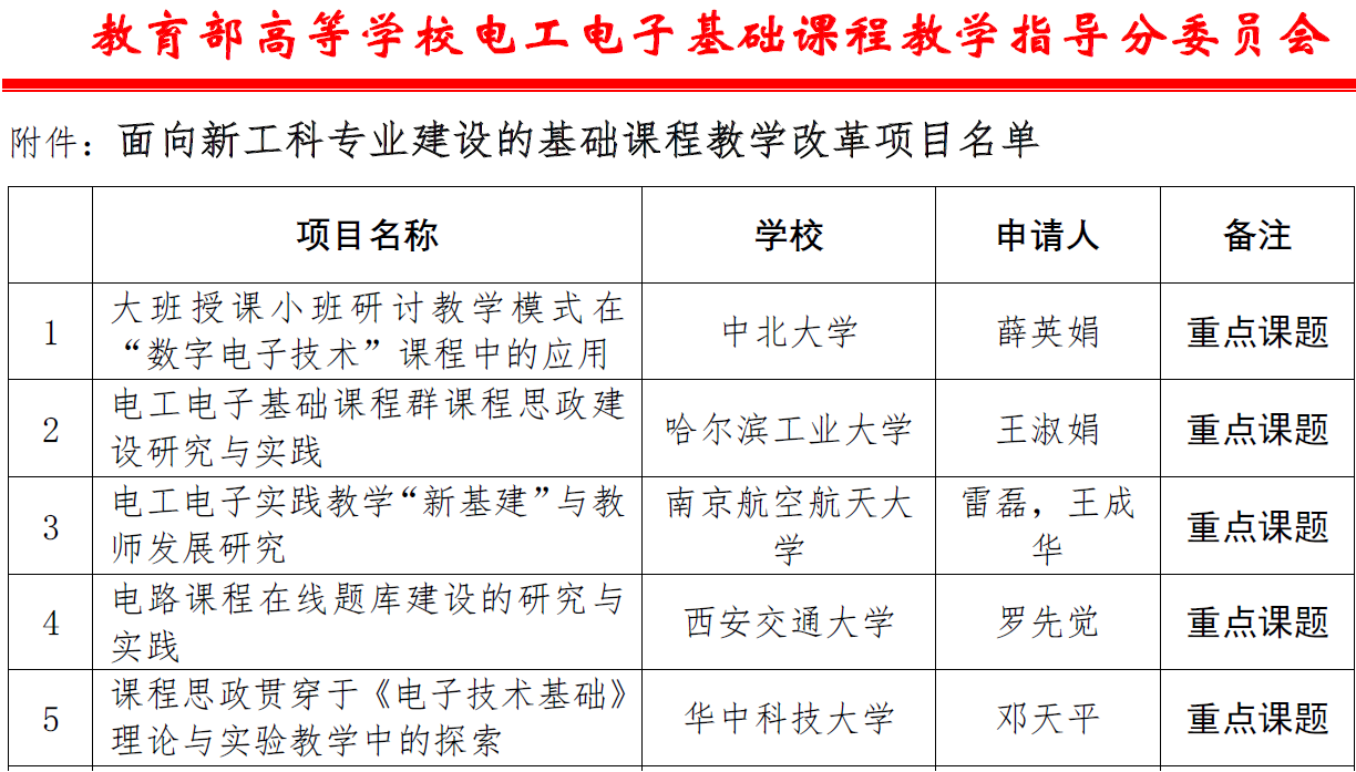 20221教育部高等学校电工电子基础课程教学指导分委员会面向新工科专业建设的基础课程教学改革申报项目进行了评审立项,共有42 个项目获得教改立项,其中14 个课题被评为重点项目,我院邓天平教师申报的《课程思政贯穿于“电子技术基础”理论与实验教学中的探索》课题获批重点项目。