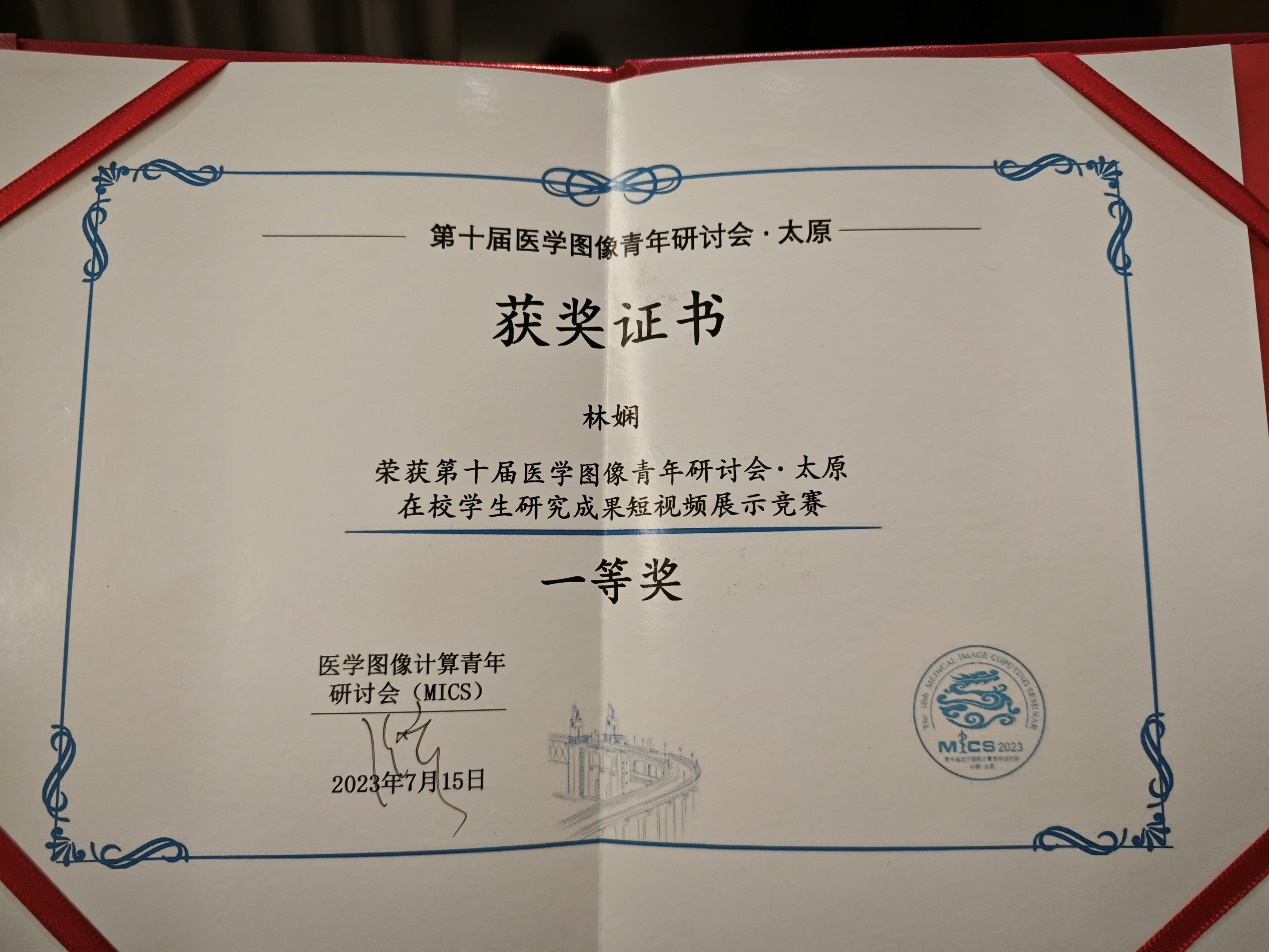 2023年7月,第十届医学图像计算青年研讨会 (MICS 2023)在山西太原隆重举办。bat365在线登录入口数字媒体与智能网络实验室((Digital Media and Intelligent Network, DMIN))的2022级博士生林娴在喻莉教授和闫增强副研究员的指导下,和来自清华大学、香港科技大学、香港中文大学、上海交通大学等20家高校的博士生硕士生同台竞技,最终在学生研究成果竞赛环节脱颖而出,荣获一等奖。