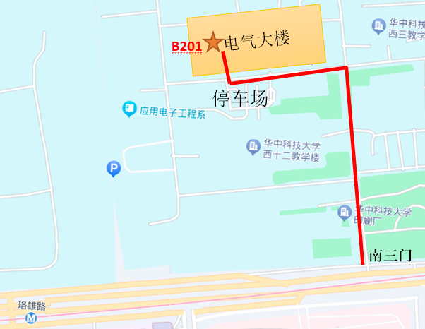 2.步行进校建议选择bat365在线登录入口南三门,进校后可按路线指示到达电气学院南广场,左侧即可见多功能厅B201入口。如从电气学院北广场进入,乘电梯或步梯上二楼即可。