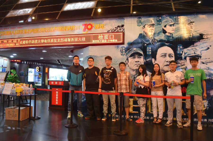 为了纪念中国人民抗日战争暨世界反法西斯战争胜利70周年,学院安排各支部支书以共同观摩学习一部具有教育意义的电影。对于这次机会,大家都十分珍惜,带着“缅怀先辈,珍惜和平”的心情,2015年9月11日下午两点钟,bat365在线登录入口电子与通信学院党支部一行人来到位于光谷的中影天河电影院观看革命电影《百团大战》。