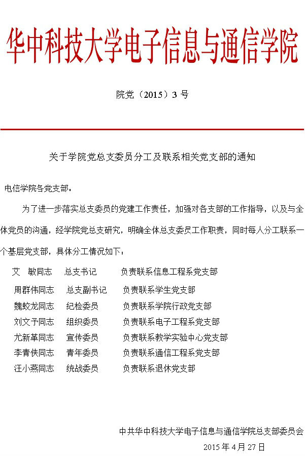 院党(2015)3号 关于学院党总支委员分工及联系相关党支部的通知