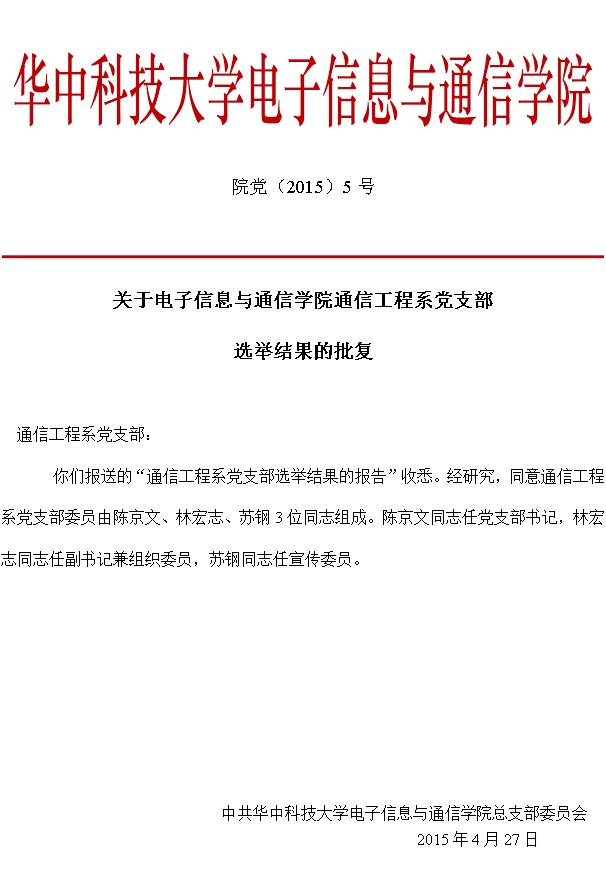 院党(2015)5号 关于bat365在线登录入口通信工程系党支部选举结果的批复