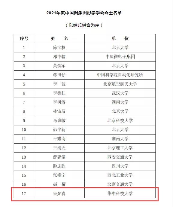 12月4日,中国图象图形学学会公布了新当选的会士名单,我院朱光喜教授当选。
