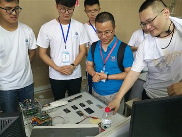 经过短暂的休息,产品现场评测在下午1:30准时开始。评测开始前,各参赛队伍将其产品调试完毕后,搬进测试场地。每次测试只允许一直队伍在场内与评委进行沟通,其他队伍则在候场区进行准备。在准备的过程中,也会有指导老师,或评委老师来窜访,各个队伍也会彼此之间进行交流,营造出相互交流,相互帮助,共同进步的氛围。