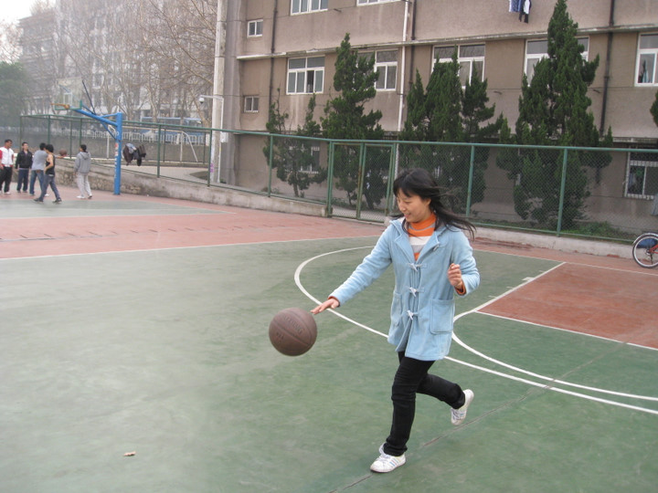 女生的比赛则更多的是欢声笑语。女生比赛是在三分钟内先绕圈,然后再运球投篮,投中篮板算一分,投进算两分,最后计算总得分。女生们每一次投篮命中,都会引起场下的热烈欢呼,其中也不乏绕圈之后迷失方向的同学艰难的投篮,更是扣人心弦。最后,马淑芬和刘畅组成的一队获得了最高分。