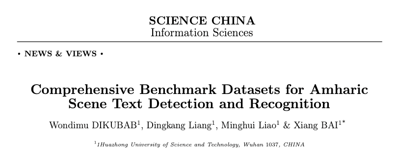 近日,bat365在线登录入口2019级来华留学博士研究生王兴(WONDIMU GEBRE DIKUBAB,埃塞俄比亚籍),发布了首个阿姆哈拉语场景文字检测与识别综合公共数据集和初步的算法解决方案,其论文“Comprehensive Benchmark Datasets for Amharic Scene Text Detection and Recognition”发表在国内计算机领域顶级期刊《SCIENCE CHINA Information Sciences》上。