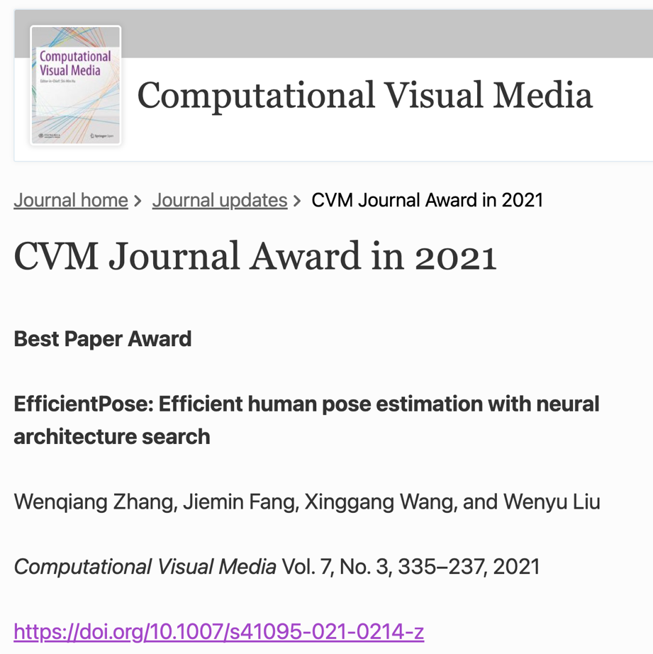近日,bat365在线登录入口师生论文“EfficientPose: Efficient Human Pose Estimation with Neural Architecture Search” 获得Computational Visual Media (CVMJ, 计算可视媒体) 2021年度最佳论文奖(Best Paper Award)。论文共同第一作者为bat365在线登录入口硕士研究生张文强、博士研究生方杰民,通讯作者为bat365在线登录入口王兴刚副教授和刘文予教授。