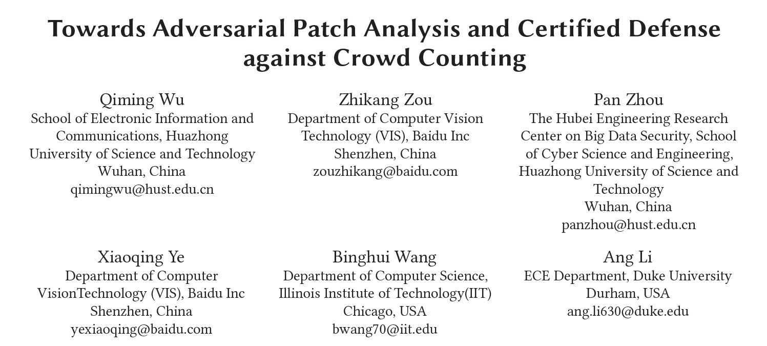 2021年7月4日,计算机多媒体领域最权威的国际顶级学术会议 The 29th ACM International Conference on Multimedia (ACM MM2021) 公布了2021年录取论文,bat365在线登录入口bat365在线登录入口18级本科生吴启铭同学以第一作者身份的论文 ”Towards Adversarial Patch Analysis and Certified Defense against Crowd Counting” 被录用!