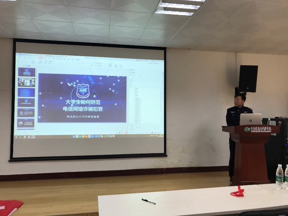 讲座伊始,安警官首先向我们讲述了防盗防诈骗安全知识的重要性,并表示在周边包括地大、二师在内的几所高校中,我校学生被骗的案例最多,这反映了我们这些同学在一定程度上相对缺乏生活经验以及警惕性。谨防上当受骗需提升防骗功夫,老师和同学们一定要在日常生活中提高警惕。