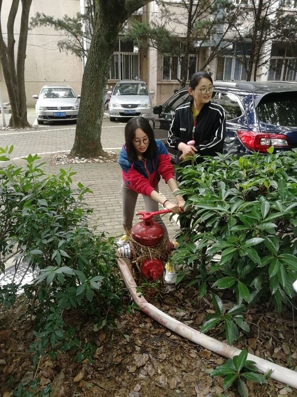 最后,舒老师为大家讲解并演示了消防栓的使用,并请中心的四个同学分为两组进行了练习。练习过程中,每组内一位同学负责连接水源,另一位同学负责将出水口对准假想中的火场。