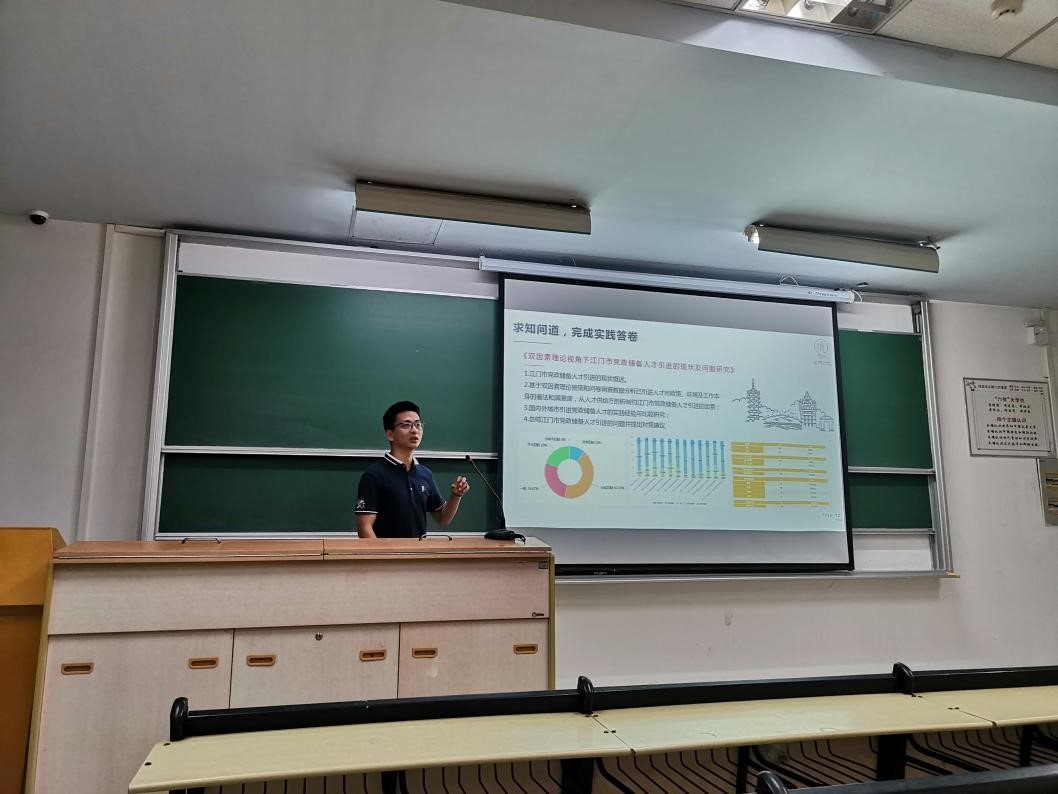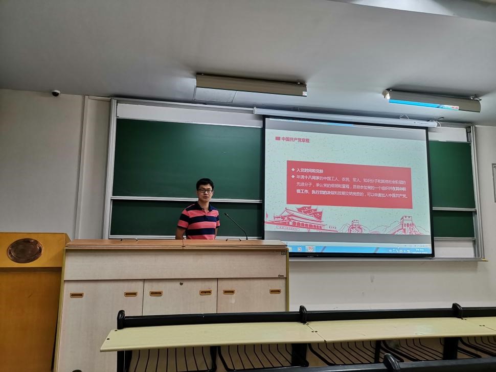 党课开始,杨杰波同学首先向大家分享了自己暑期挂职江门市的经历。他介绍说,自己是工科专业,却被分配到了市财政局,这无疑是一个巨大的挑战。但是经过努力摸索,他最终在复杂的工作中做到了游刃有余。他指出,专业积累和眼界是我们的优势,缺少实践锻炼则是我们的薄弱之处,勉励大家要把学在华科的优良传统传承并发扬下去,在实践中不断弥补不足,努力成长为复合型人才。最后,他送给新生党员“胸怀天下,打怪升级”,“既自找苦吃,也善于化解”等一番寄语,鼓励大家毕业后到祖国最需要的地方去发光发热。