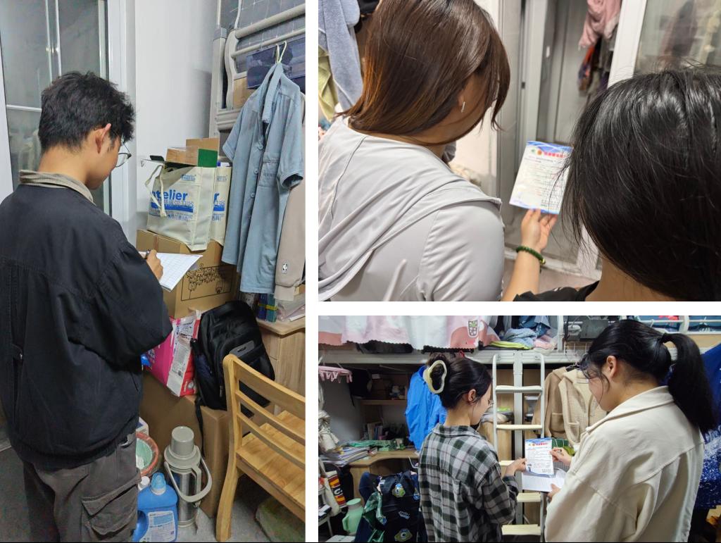 检查过程中,研工组重点排查了寝室电器使用规范、排插用电安全、物品堆放情况及整体卫生环境,并与同学们亲切交流,宣传反诈知识,了解实际需求。
