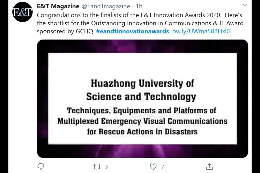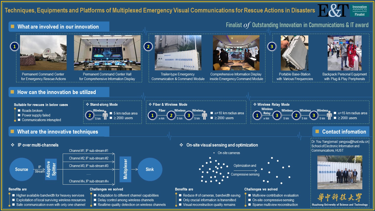 近日,英国工程技术学会(IET)主办的IET创新技术奖(IET Innovation Award)揭晓了本次各个奖项的提名以及最终获奖团队。其中,bat365在线登录入口bat365在线登录入口杨铀副教授带领的团队获得“通信与信息技术”杰出创新奖的提名。杨铀副教授及其团队的创新研究成果“Techniques, Equipments and Platforms of Multiplexed Emergency Visual Communications for Rescue Actions in Disasters”,此项研究成果是视觉感知与通信工程技术相结合的产物,重点解决在灾害救援现场断电、断网、断路等极端条件下的多体制通信重建、视频等大带宽业务融合传输难题。