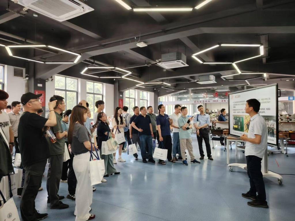 然后老师们参观了电气学院教学实验中心,实验中心主任尹仕老师介绍了中心的环境、管理方式和人才培养模式,强调注重赛课结合,通过引导和支持年轻老师参与竞赛指导,以及竞赛获奖学生当助教等措施来推动竞赛创新。最后与会老师们根据个人研究兴趣分成三组,由尹仕、易磊、冯学玲老师讲解中心在电源、控制、无人机三个竞赛方向上的进展。