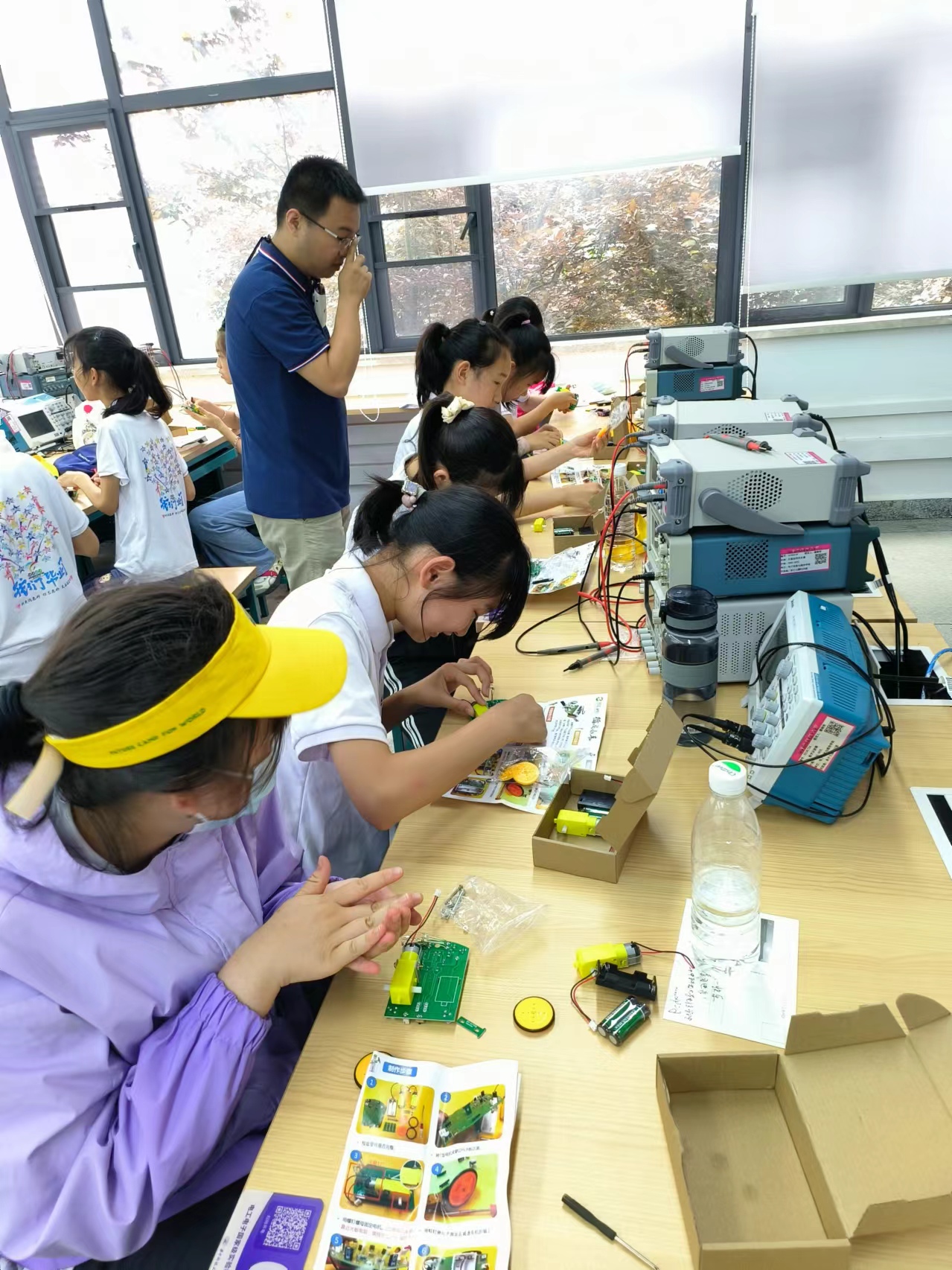 接着,就是小朋友翘首以盼的动手实验:《循迹智能车原理探究与制作》,首先,夏景圆老师通过PPT给小朋友讲解了循迹智能车的基本原理和制作过程,以及组装循迹小车的注意事项。活动开始后,同学们根据老师的指导与组装教程,很快就从认识组件过渡到组装环节中。在这一环节,每位同学都成功组装出循迹小车。最后,为了确保循迹小车不仅能动起来,更要跑起来,同学们细心在轨道上进行调试。当小车正常循迹跑动时,小朋友们一个个欢呼雀跃。