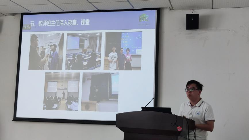李渝舟以“我的三次班主任之旅”为题报告了担任班主任期间的工作概况和主要成效,并从建立“君子协定”般的师生关系、“四梁八柱”般的搭档关系、“按需补给”般的引导关系三个方面分享心得体会,呼吁各位班主任着力帮助学生全面发展和健康成长,齐心协力为学院人才培养工作贡献力量。