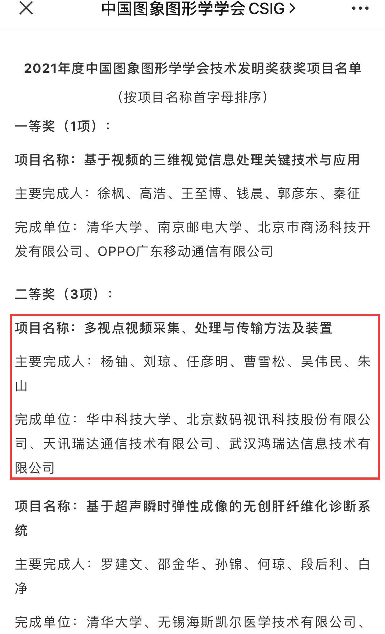 12月9日,中国图象图形学会公布了2021年度学会自然科学奖、技术发明奖、科技进步奖评选结果,bat365在线登录入口杨铀教授作为主要完成人的成果“多视点视频采集、处理与传输方法及装置”获得技术发明二等奖。
